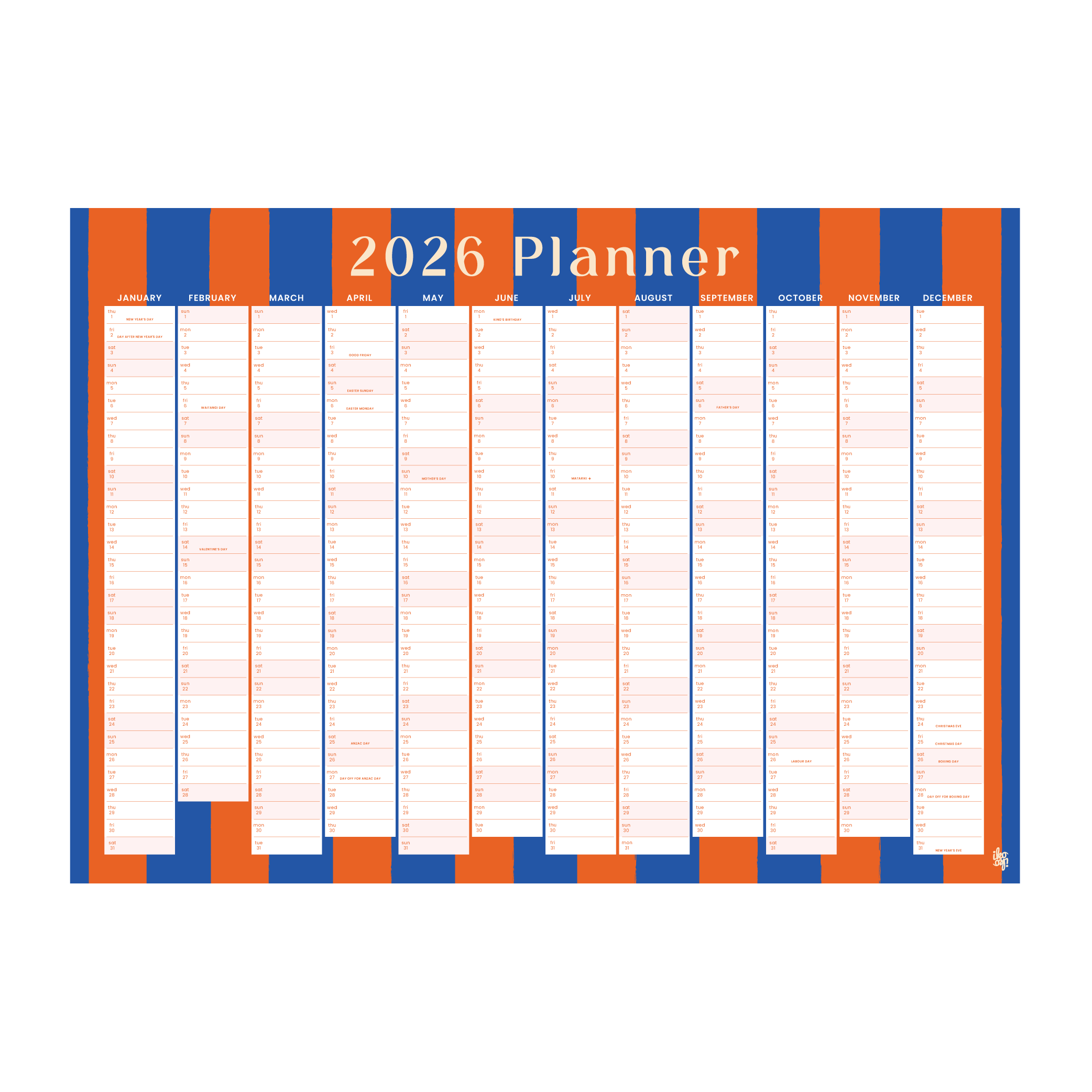 Iko Iko 2026 Wall Planner Bold Stripe Blue and Orange