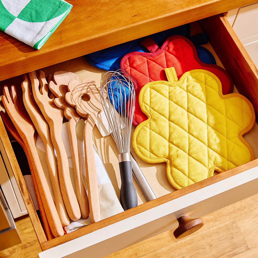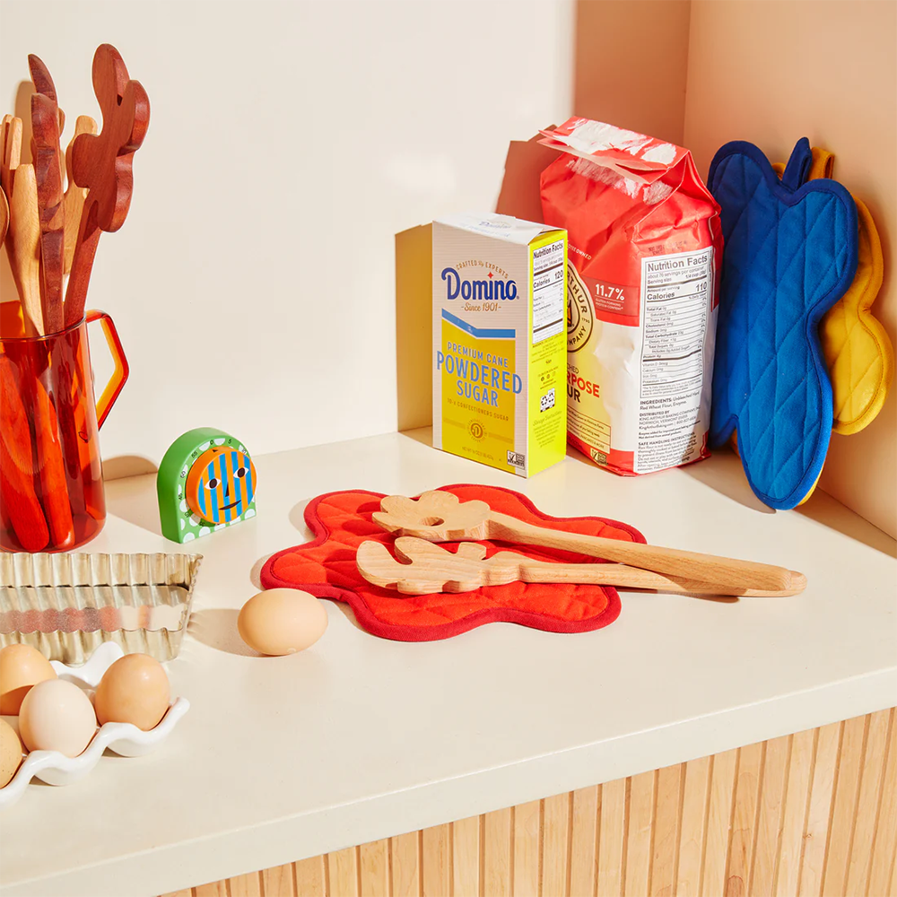 Made with quilted cotton and cut in a floral shape, this potholder keeps hands and surfaces cool when dishes are too hot to handle.