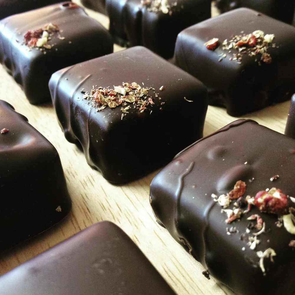 Ingredients: Chocolate (cocoa mass(73%), sugar, cocoa powder, emulsifier (soya lecithin), Cream, Butter, Bush Honey, Star Anise, Fresh Ginger, Cardamom, Szechuan Pepper, Cinnamon, Vanilla Pod.