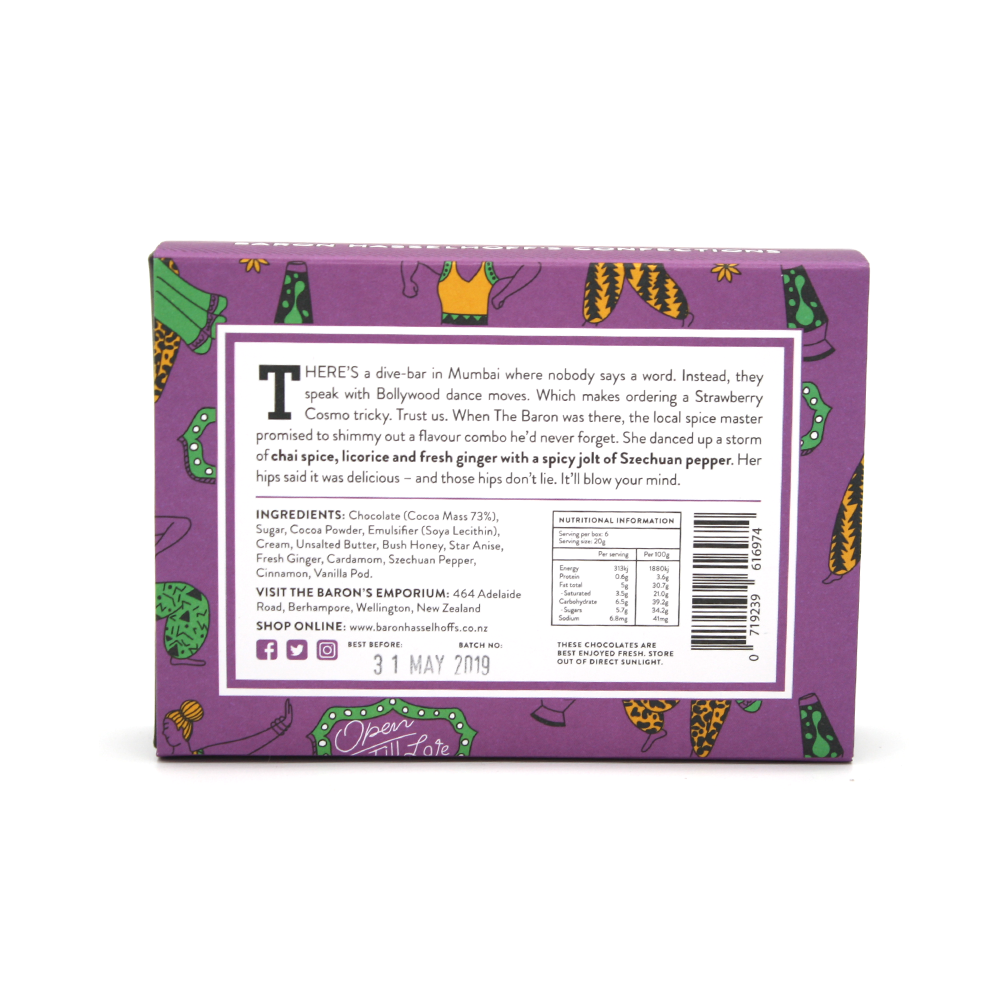 A fine blend of 73% dark chocolate with chai spice, liquorice notes, fresh ginger and a spicy hit of Szechuan pepper.