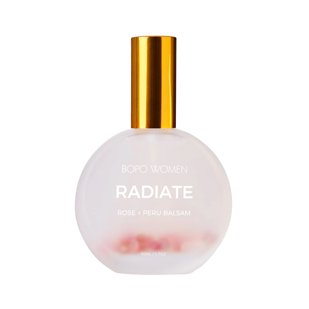 Indulge in the sweet and spicy scent of Radiate. Starring passionate florals, delicate rose damascena adds sweet pink notes with long-lasting depth, while fruity and flowery ylang-ylang softens the balsamic woodiness of sandalwood. Peppery sharp ginger adds a warm fiery element and smoky Peru balsam a touch of vanilla, wood and cinnamon.