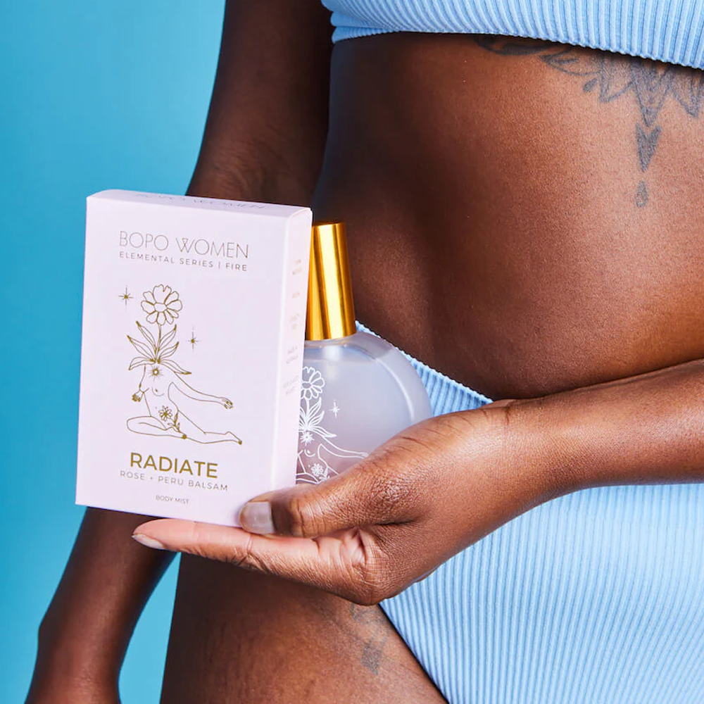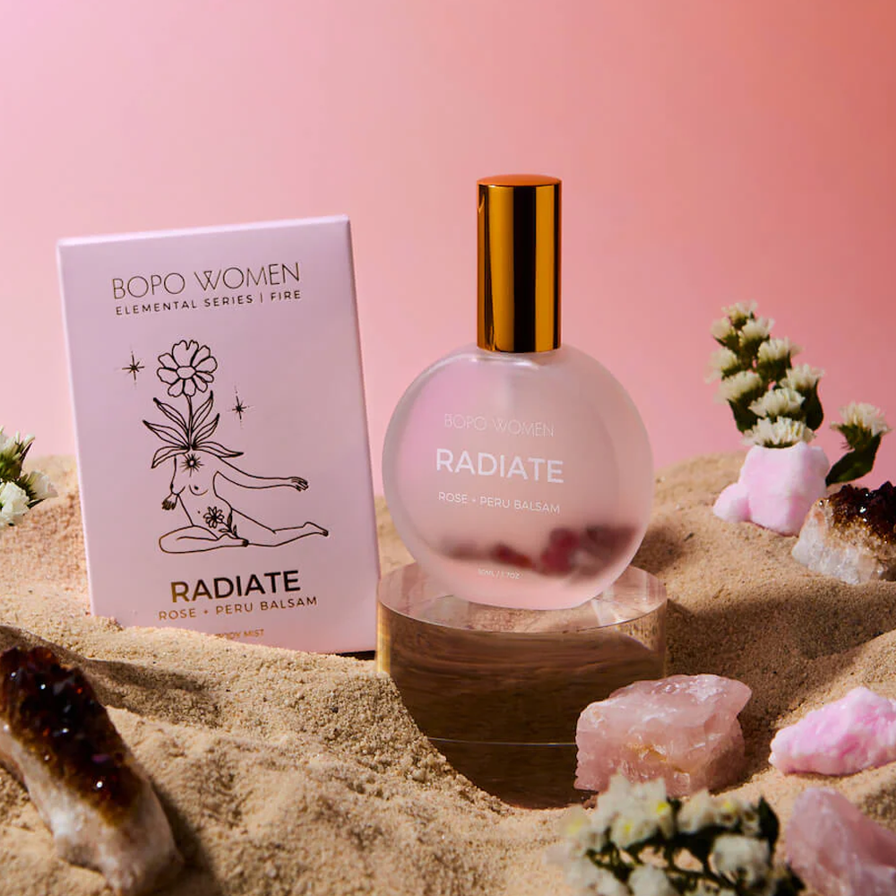 The Radiate Body Mist embodies the fire sign element (Aries, Leo, Sagittarius) and comes with a beautiful gold foil Fire Woman Tarot Card.