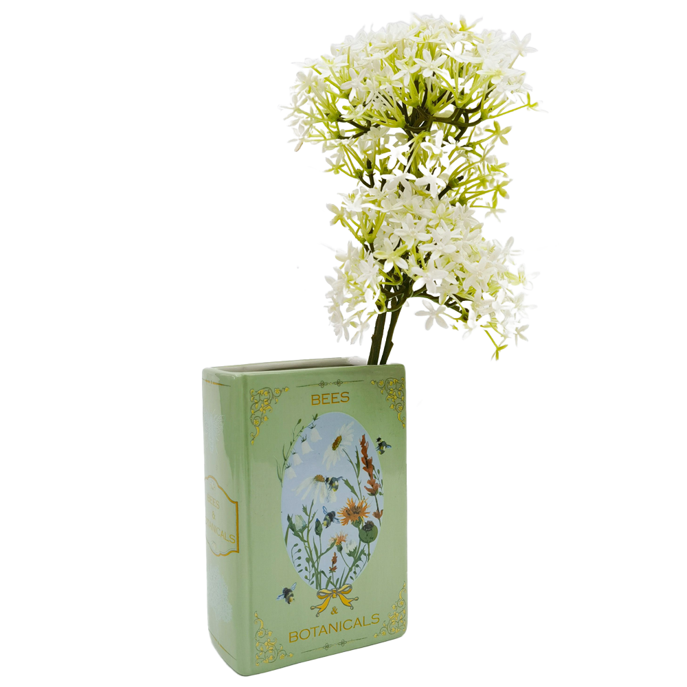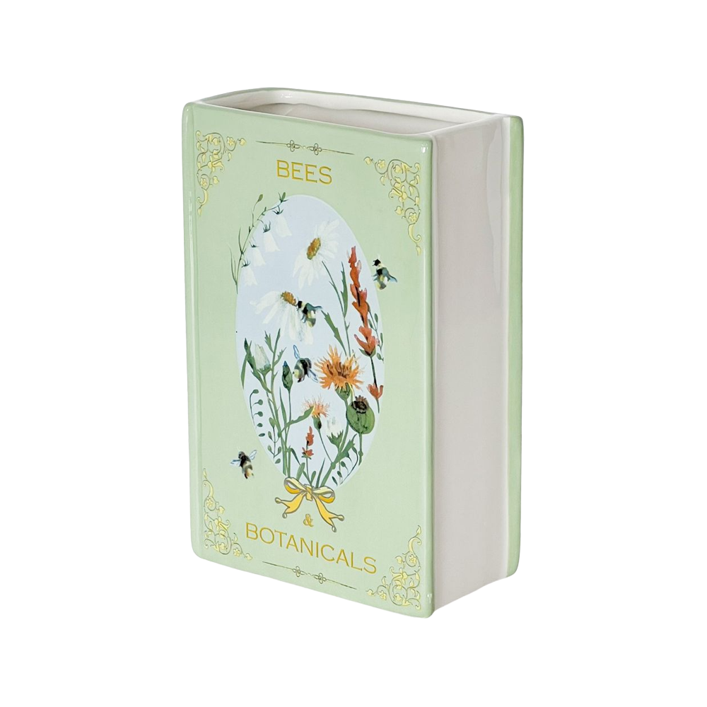 This ceramic vase, inspired by the charm of storybook illustrations, features intricate bees and botanical motifs in a serene green hue. Combining whimsical design with practicality, it’s perfect for displaying fresh or dried flowers, or as a decorative accent on its own. With its unique book-like shape and nature-inspired details, it adds a touch of enchantment to shelves, mantels, or tabletops.