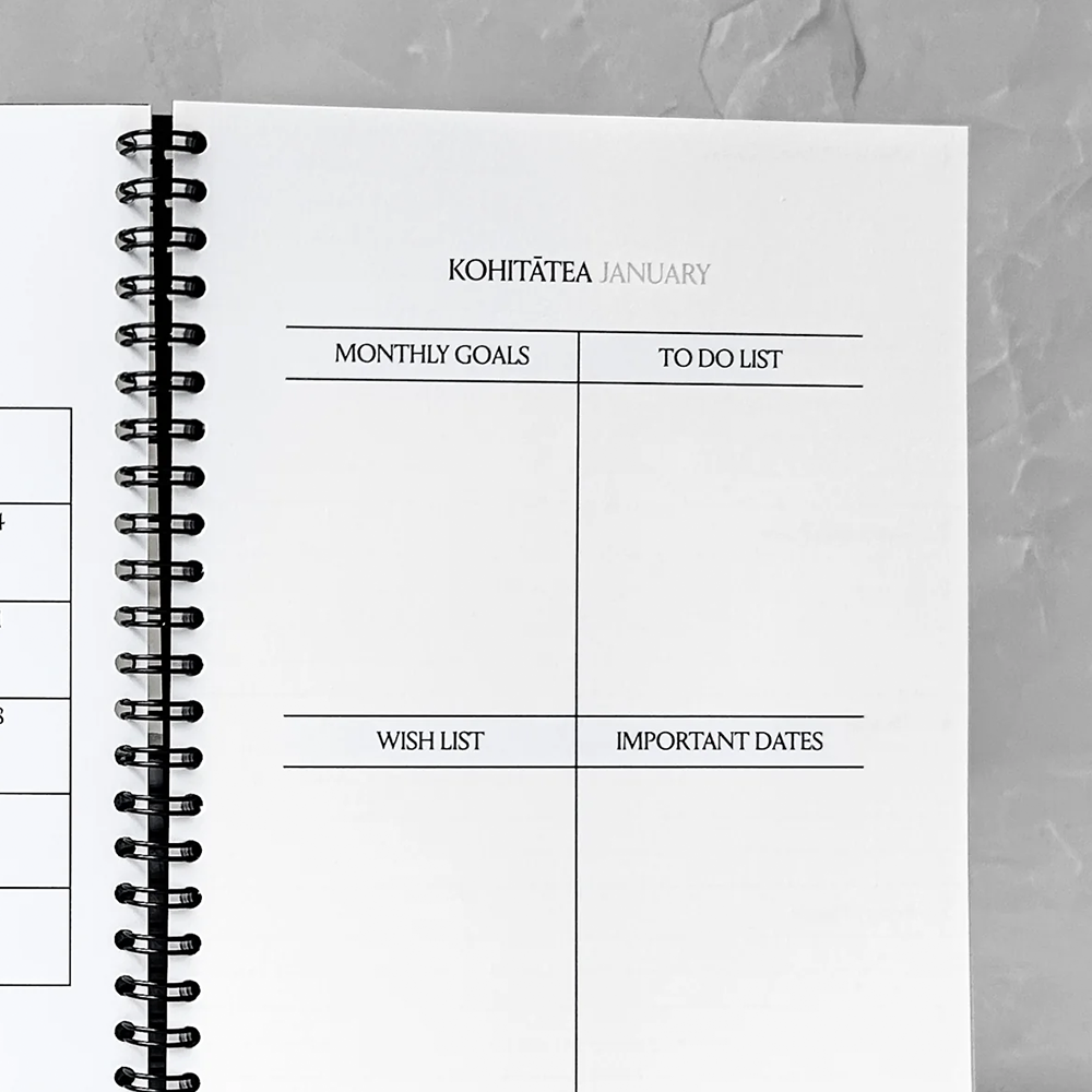 - The month page is opposite a page of various lists to help set your intention for each month.