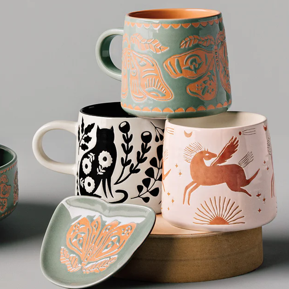 A turquoise and terracotta ceramic glazed mug by Danica Studio, featuring a moth design. Crafted using the traditional wax-resist technique.