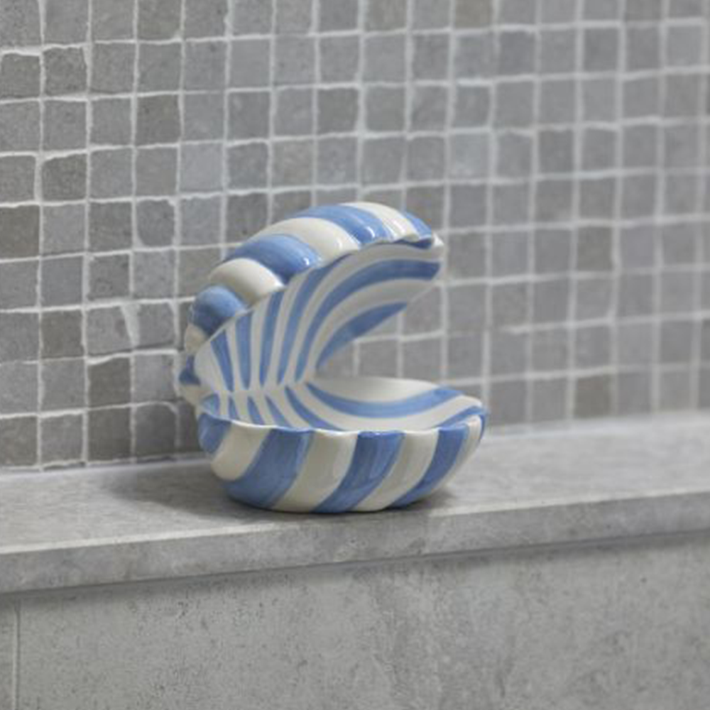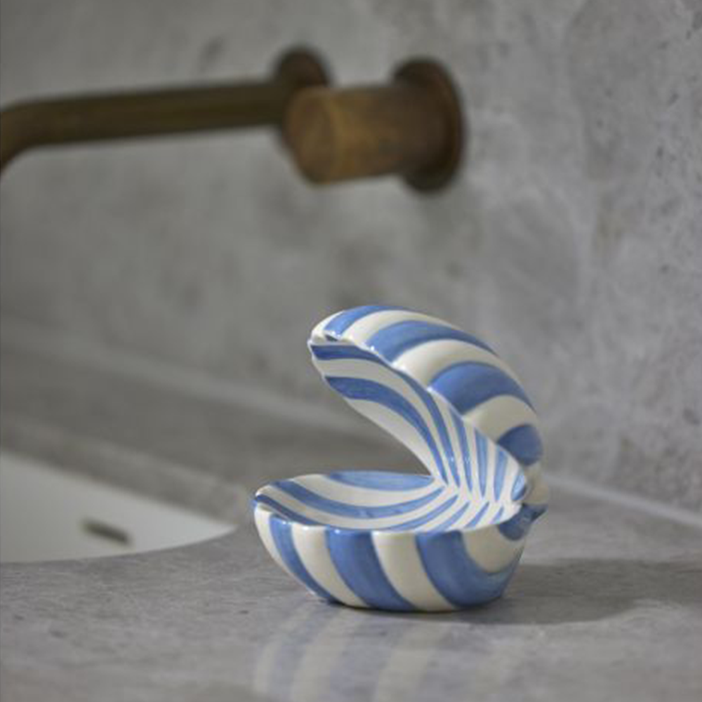 This Zona Clam Dish brings nautical charm to your space with soft blue and ivory stripes and clam shape.