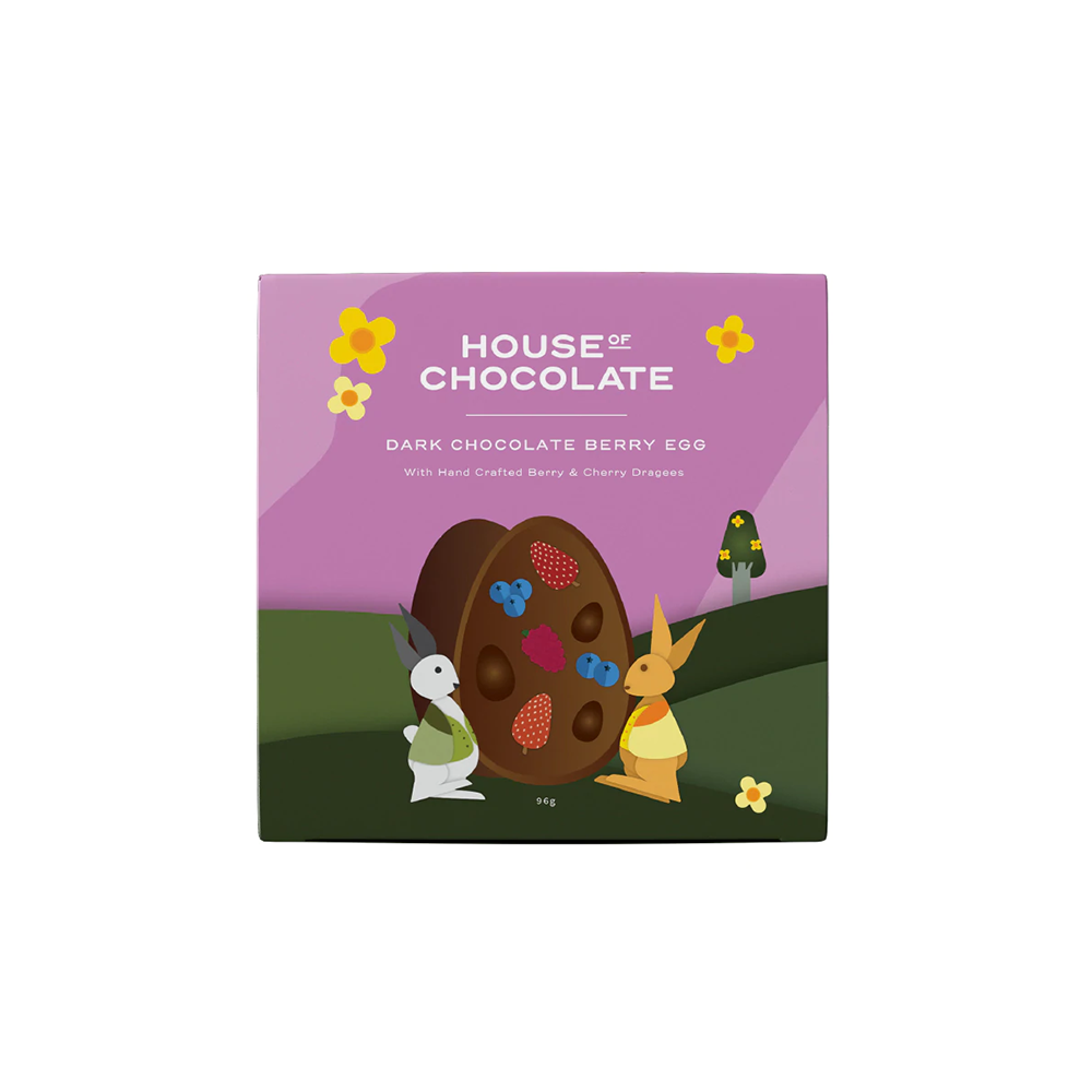 Rich dark chocolate egg sprinkled with berries, filled with a selection of 70% organic dark chocolate freeze-dried blueberry, boysenberry, raspberry and cherry dragees.