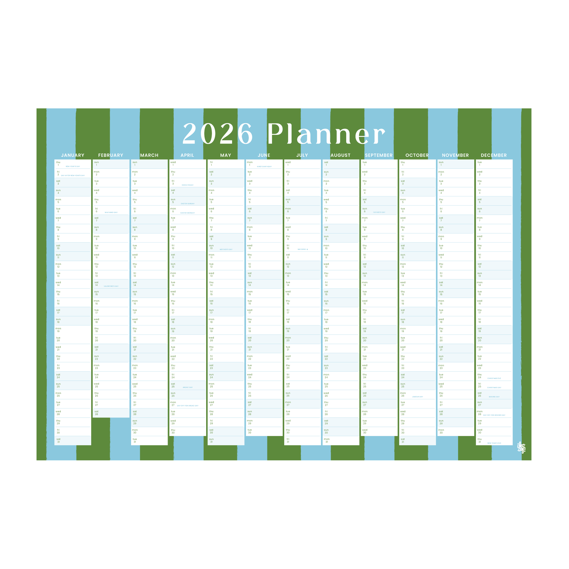 Iko Iko 2026 Wall Planner Bold Stripe Green and Blue