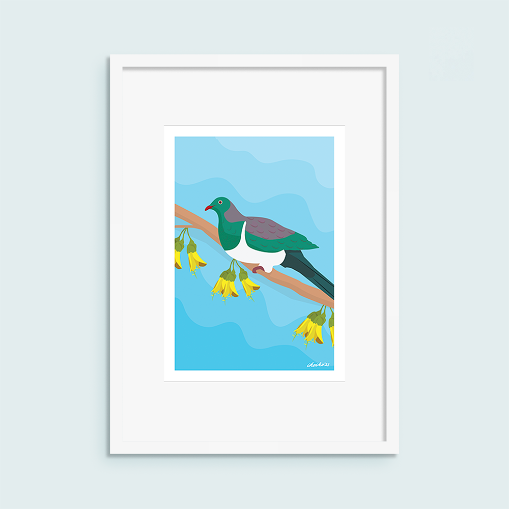 Pop your print in a frame or pick a few of your favourite designs to create a personalised display. Match this lovely kererū with the tui and fantail from the range.