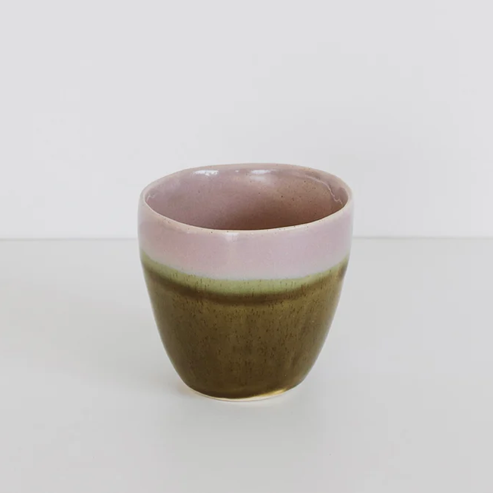 Handmade travel cup, dipped with moss green and satin lilac glazes. Made with their unique porcelain/stoneware blend oatmeal clay, coloured with pottery stains, oxides and foraged Coromandel black sand.