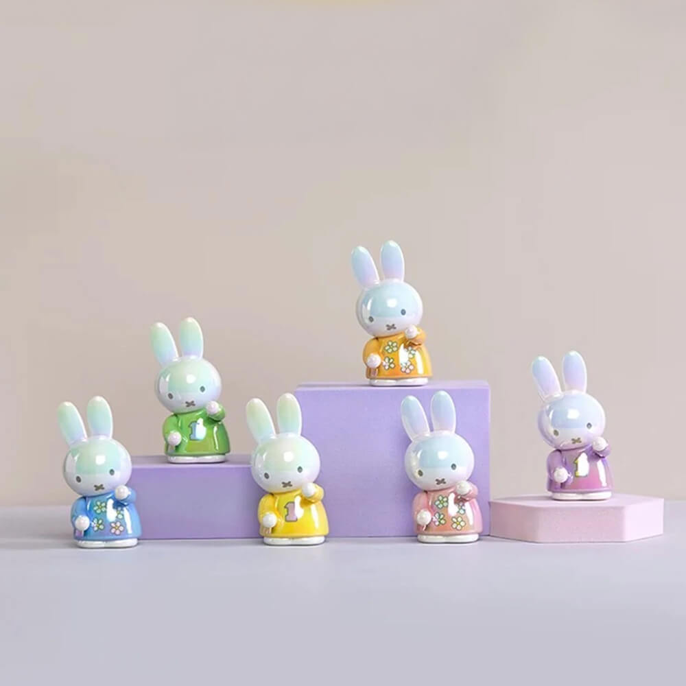 Each blind box reveals a surprise Miffy figurine, sweetly posed holding a small accessory and dressed in soft pastel outfits.