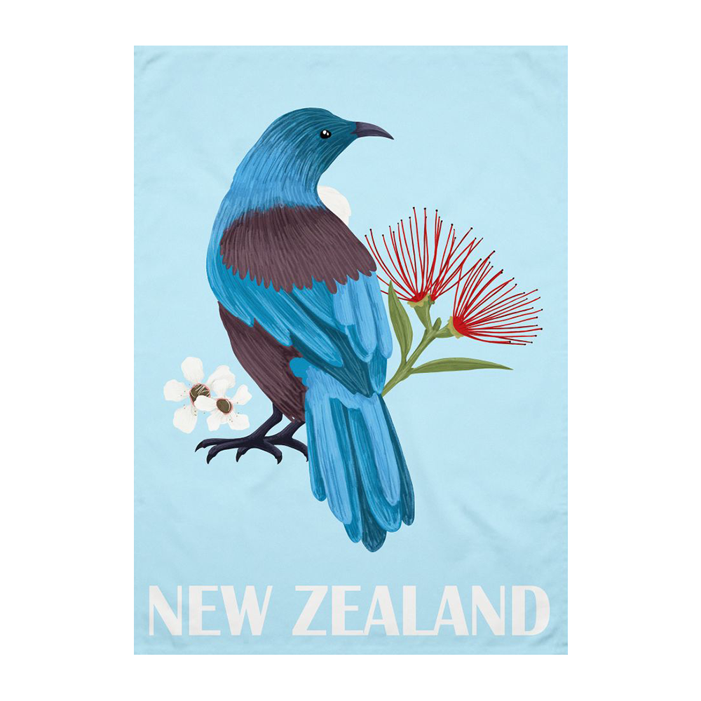 A tea towel with a vibrant Tui print. The perfect way to bring some New Zealand nature into the kitchen with a pop of colour.