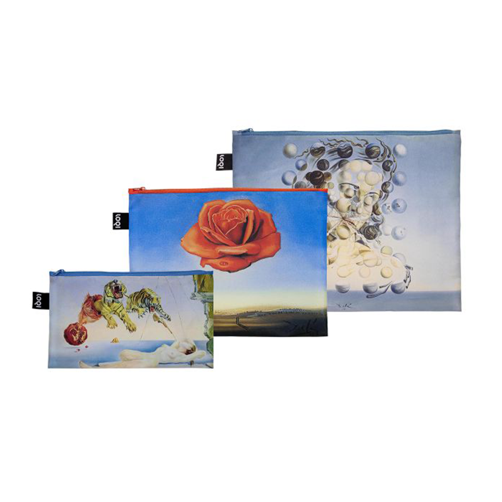 Intriguing surrealism meets hidden symbolism. Explore visual paradoxes with Salvador Dalí’s floating roses, pomegranates, and tigers—symbols of beauty, fertility and strength—on these recycled zip pockets. Water-resistant so great for all kinds of storage or travel.