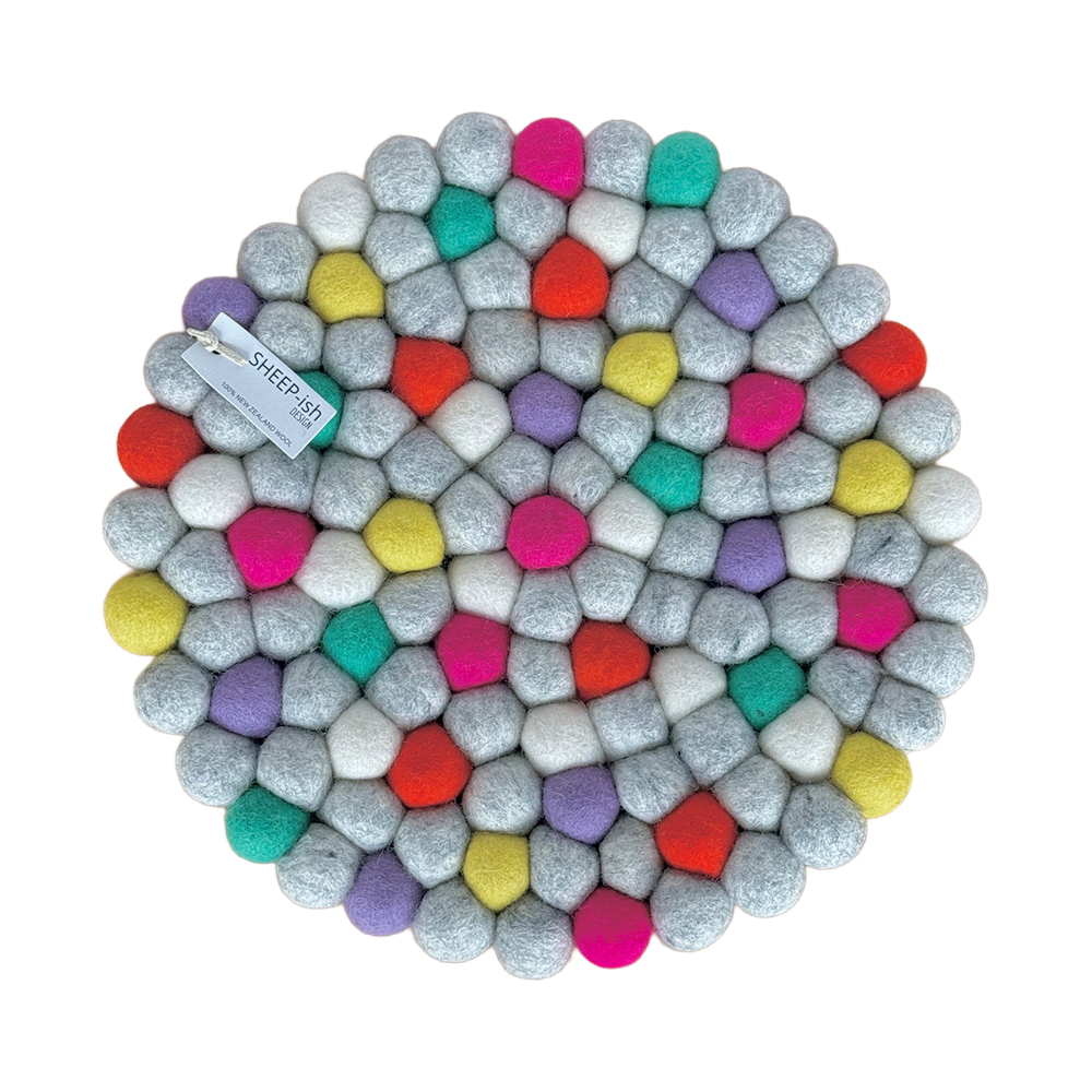 A beautiful felt ball pot stand in colourful bright tones. Handmade in Nepal using 100% NZ wool, non-toxic dyes.