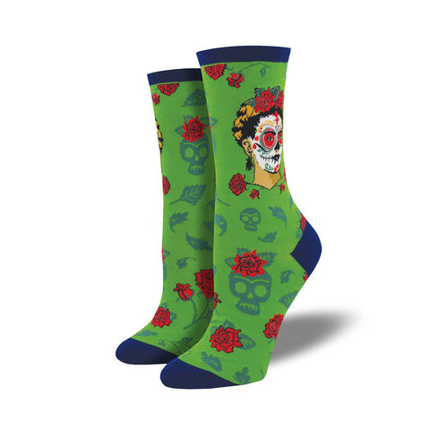 With Frida Kahlo’s embrace of Mexican culture, these socks feature her portrait with an iconic muertos skull. Surrounded by roses and skulls, this sock is full of pattern and colour to represent Frida and the Day of the Dead.