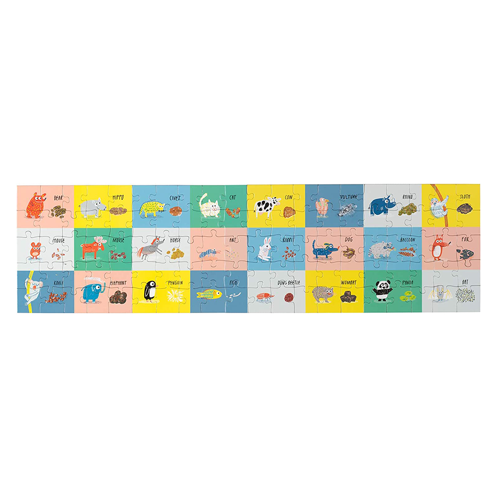 This is a giant 100 piece floor jigsaw puzzle showing animals and their poos! Once complete the puzzle is just under 3ft wide! The sturdy puzzle pieces are presented inside a brightly coloured box.